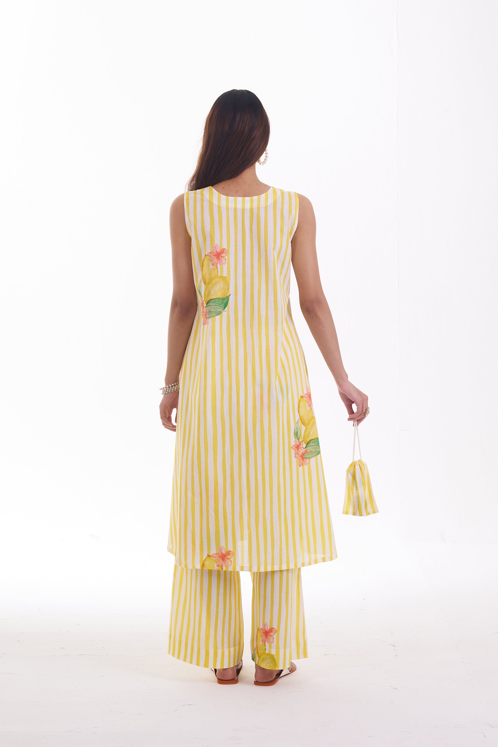 This sleeveless yellow long kurta features subtle vertical stripes and delicate lace detailing along the panels, paired with matching floral palazzo pants adding a soft feminine charm