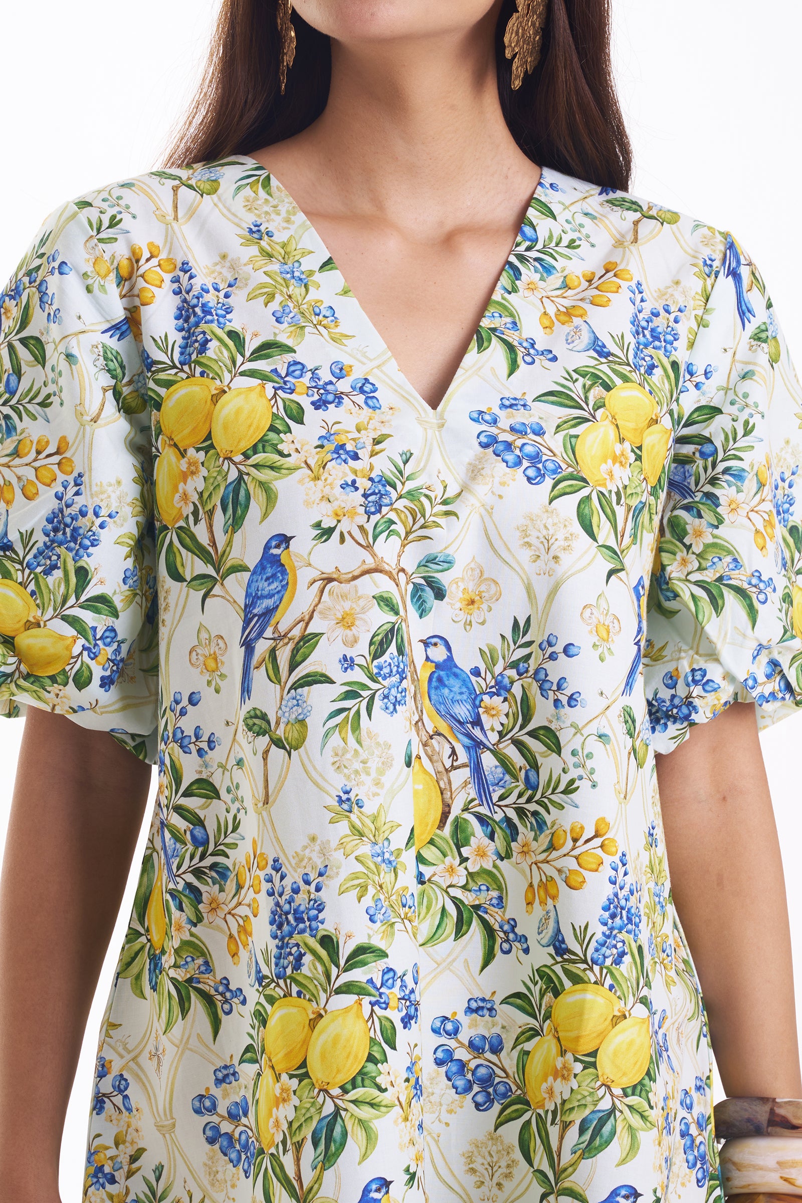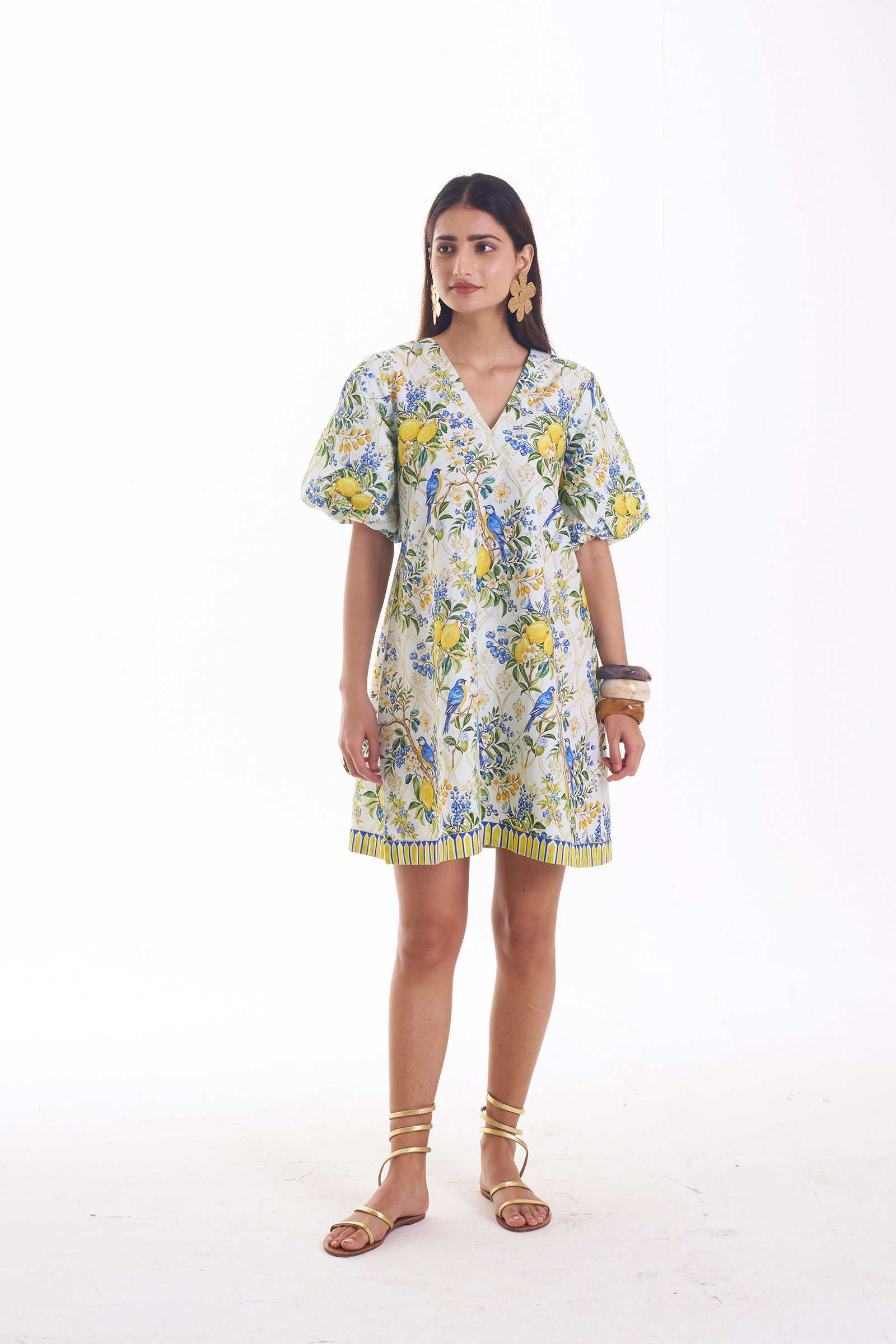 This breezy short dress is crafted from crisp cotton fabric with bright yellow lemons and blue songbird prints. A flattering V-neckline and puff sleeves add a romantic touch. The relaxed A-line silhouette ends mid-thigh, finished with a striped border at the hem—perfect for sunny days and vacations.