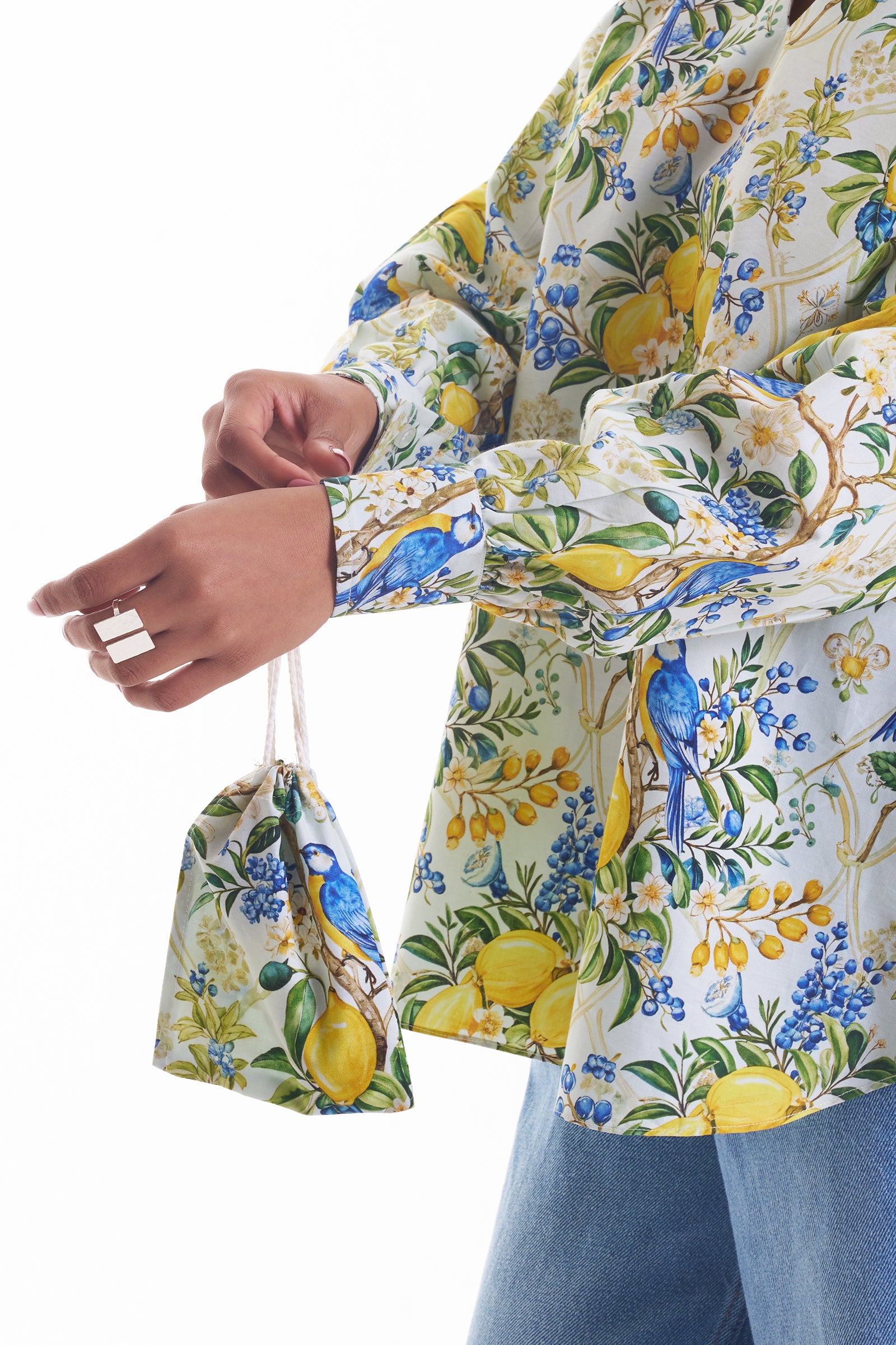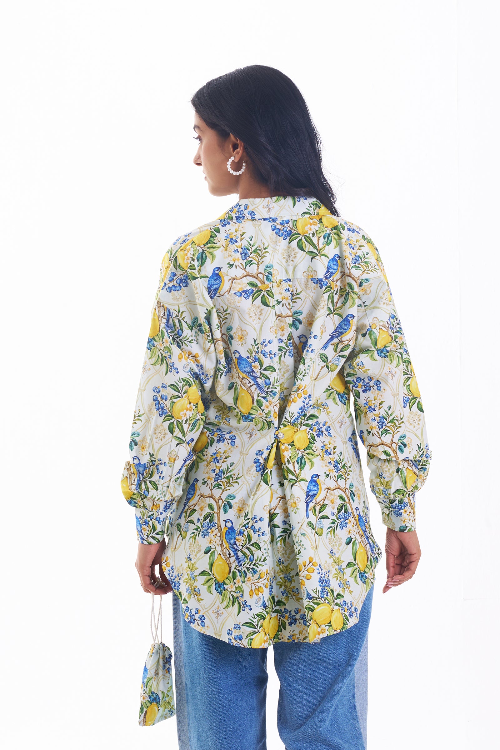 This multicoloured shirt features a bright print of lemons, green leaves, and blue songbirds. Designed with a flattering V-neckline and long balloon sleeves gathered at the wrists, it offers a relaxed, slightly oversized fit with a modern high-low hemline. A back button ensures a perfect curve fit.